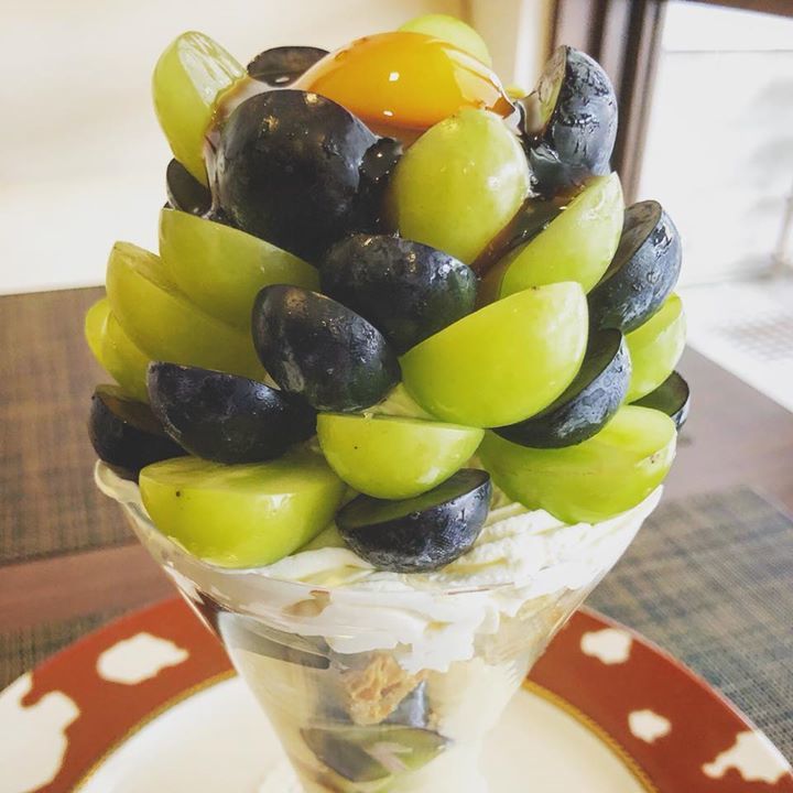 マスカットのパフェです。ボリューミーなパフェなので気温が25度を下がるまで解禁していませんでしたが今日から販売始めました。上からアイスクリーム マスカット 巨峰 黒蜜をかけて!その下にさらにアイスクリーム🍨シフォンケーキ🍰パイ生地🥧カスタードクリームにぶどうです🍇