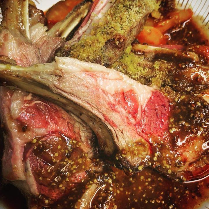 写真はディナーのメイン料理 子羊の香草パン粉焼きです。ソースは子羊の骨や筋を焼いて香味野菜とトマトを合わせて煮込んで煮詰めたものにマスタードを合わせた物です。
