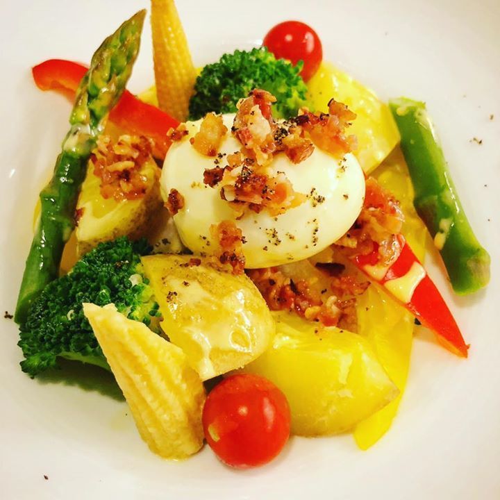 写真はオードブルのウフ ポシェです。彩り野菜を茹で上げてマヨネーズと絡めてゆで卵を合わせるサラダです。オードブルも温かいものに変えています。