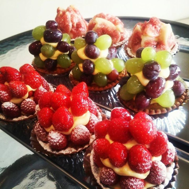 本日のケーキの一例。イチゴのタルト 葡萄のタルト いちじくのタルト。フルーツは旬のものを使って。イチゴはもうすぐ終わるから次は枇杷とかメロンかな?