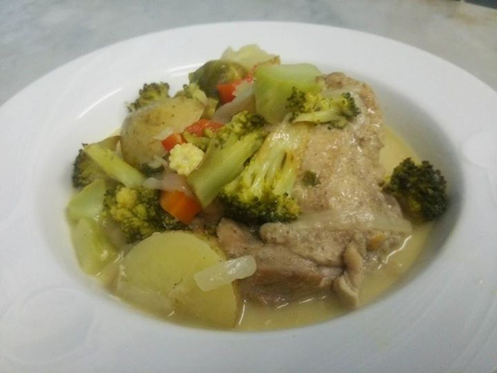 若鶏の白ワイン煮。よく作る一品ですが今回は野菜たっぷりで煮込みました。バターライス添えます。