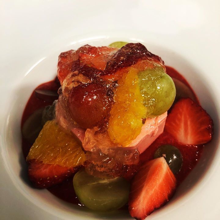 いちごとヨーグルトのパルフェグラッセ いちごのスープとフルーツ マスカットワインのゼリーをかけて