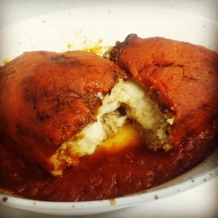 ドイツ産モッツァレラチーズを入れて焼いたハンバーグをトマトソースで煮込みました。ボリュームありますよ。