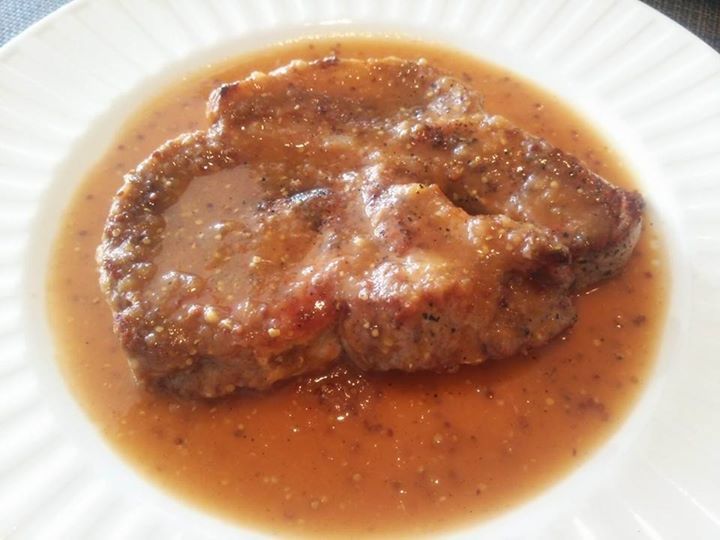 豚の塊肉を買ったので試食しました。五キロ以上の肉なんて久々。ソースはマスタードを使ったシャルキュティエール風。