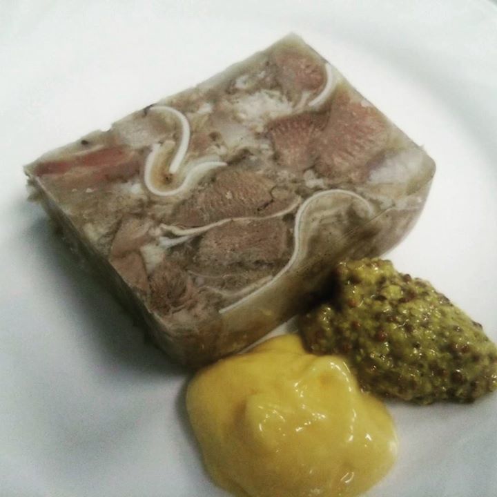 フロマージュ ド テット ビストロの定番料理の一品。豚舌 豚耳 豚鼻の煮こごりをテリーヌにした物です。酸味のあるソースやマスタードでいただきます。