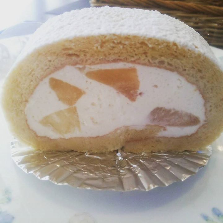 小麦粉不使用の米粉のロールケーキです。中のフルーツは季節で変わりますが今は山梨県の桃が入荷しましたので桃のロールケーキです。たっぷりの北海道産の生クリームと味わって下さい。