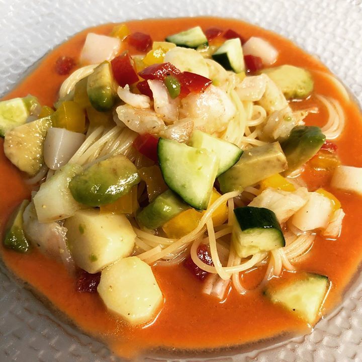 トマト🍅を主にした夏野菜のスープの上に細麺に絡めた野菜や魚介を合わせています。