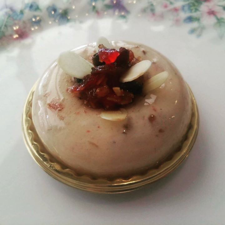 新作のヌガティーヌです。はちみつ漬けにしたナッツとドライフルーツをはちみつのババロアで包んだフランス菓子です。かなり濃厚なガトーになりました。