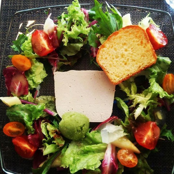 鮎のパテです。鮎を丸ごと食べられるように加工して提供します。柔らかく蒸した鮎に生クリームとバター、香草を合わせてテリーヌ型で固めてあります。キウイとキュウリのシャーベットを添えて!パティシエが作る鮎の料理を堪能してもらう一品。