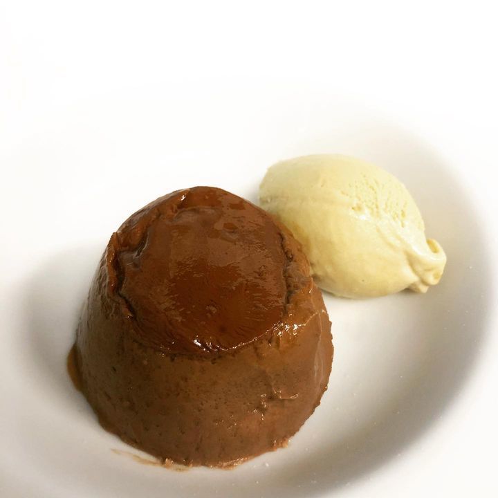 濃厚な🍫チョコレートプリンに🍮ピスタチオのアイスクリームを添えて