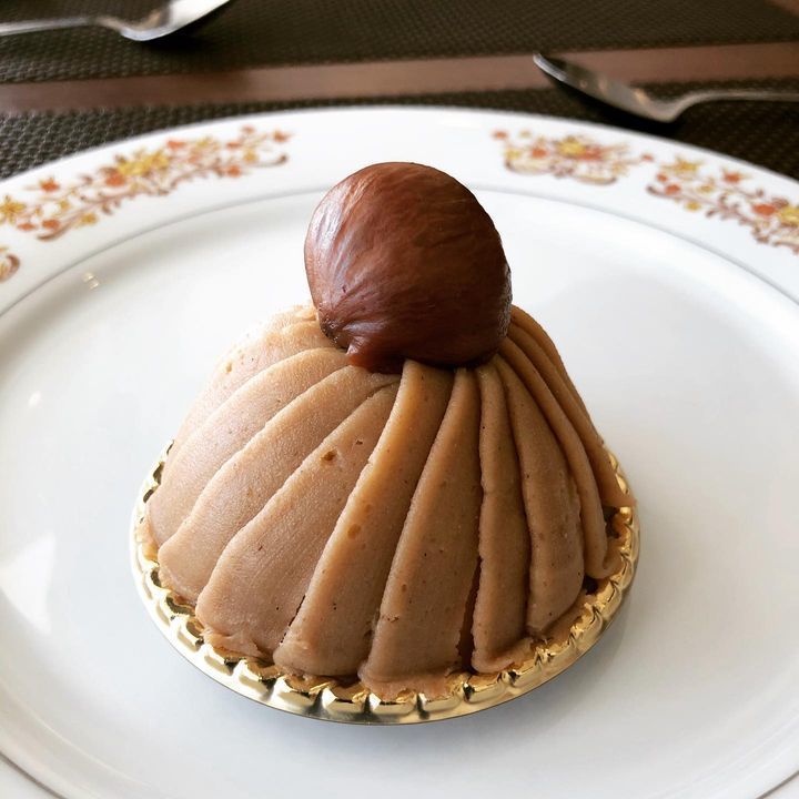 バターソテーした洋梨と塩キャラメルのババロアを栗のクリームで🌰覆っています。