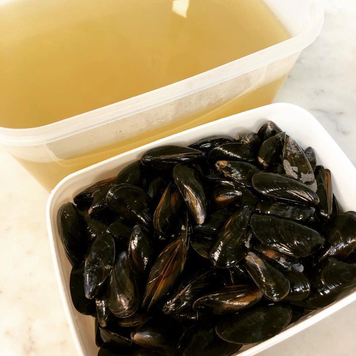 ムール貝はしっかり掃除してアサリやムール貝や香味野菜で取ったブイヨンと合わせます