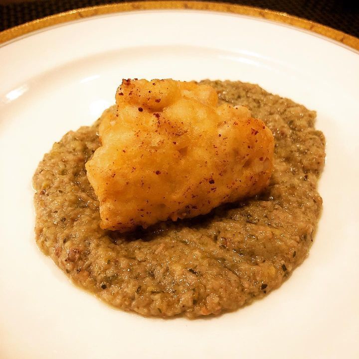 カリッと揚げた白子にズッキーニ アンチョビ ケッパー クルミ オリーヴオイル ピクルスを合わせた酸味の効いたピューレソースでいただきます。