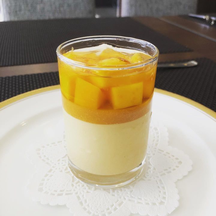 市販のピューレではなくフレッシュのマンゴーとアングレーズで作ったプリンにマンゴーのジュレソースとフレッシュマンゴーにココナッツのジュレの組み合わせ🥥