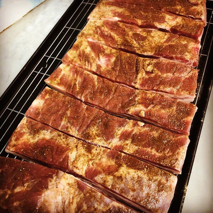 豚バラは自家製のエピスでマリネして数日置いてから余分な水分出して今日ベーコンにしました🥓