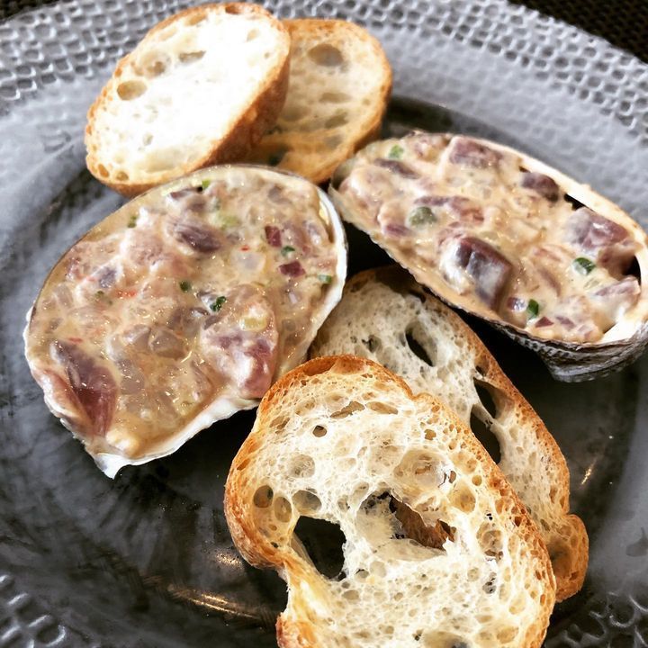 写真はアワビ 甘エビ ハチビキのタルタルです。