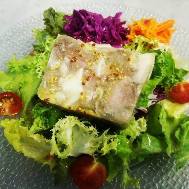 蒸し暑い日が続く名古屋です。でもどこも暑いのにはかわりなし!今出しているオードブルの一品。フロマージュ ド テット。豚の頭の部位を使ったゼリー寄せですが耳 鼻 舌と三種類を柔らかく煮てギュッとテリーヌ型に押し込んで固めた物です。コラーゲンたっぷりでサラダたっぷりにマスタードオイルでさっぱりと提供しています。食欲もなくなる時期ですが、冷えたワインやビール等と合わせて食べると食欲もわいてきます。皆様の来店お待ちしていますm(_ _)m