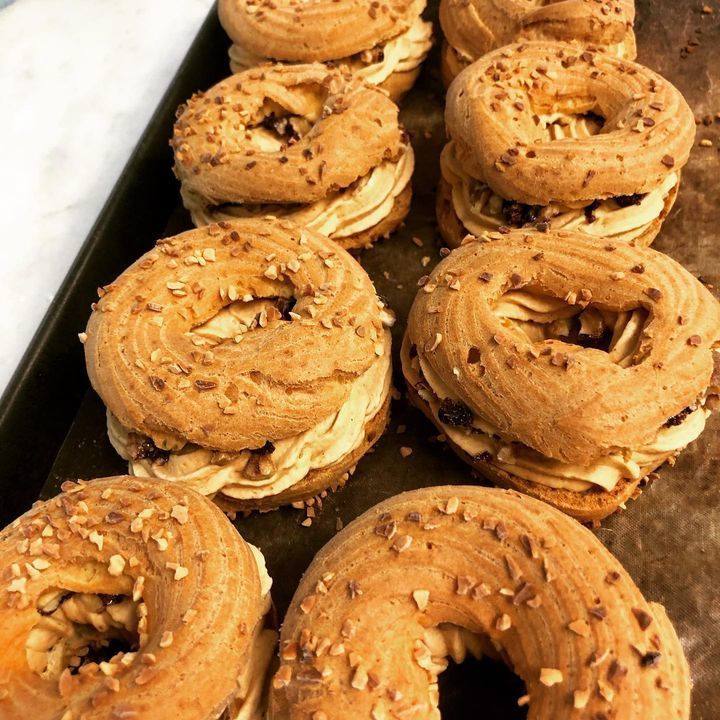 車輪の形に焼き上げたシュー生地を半分にカットして中にアーモンド風味のカスタードバタークリームとカリッとした食感のくるみのプラリネを入れてあります。フランスの🇫🇷自転車🚲レースを記念して作られたフランス菓子。