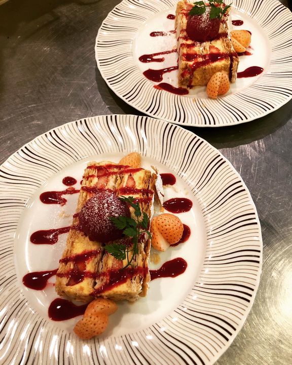 ナポレオンパイに白イチゴと木苺のソルベをトッピング。