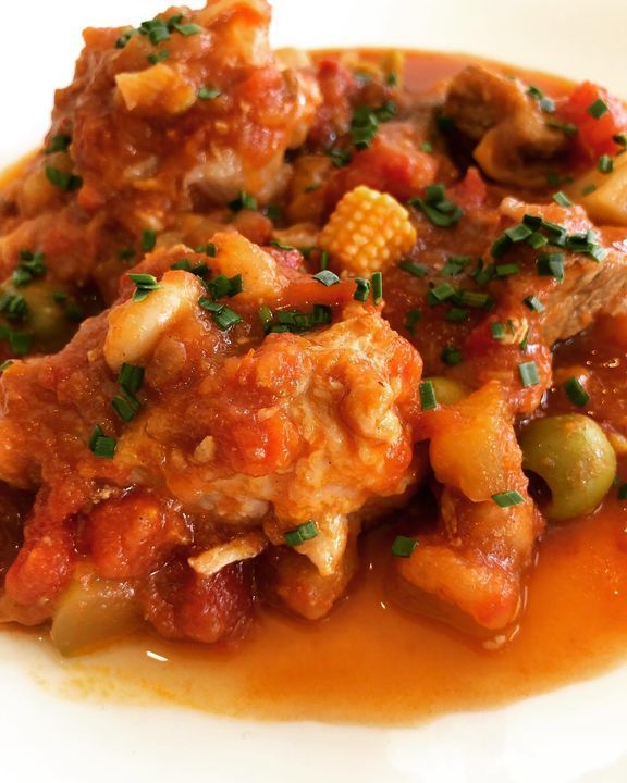 肉料理の豚肩ロースのトマト 白ワイン オリーブの煮込みです。