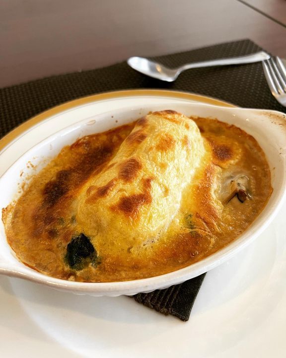 たらや帆立貝で作ったムースを海老風味のクリームソースをかけてオーブンで焼いたフランスの定番料理です🇫🇷