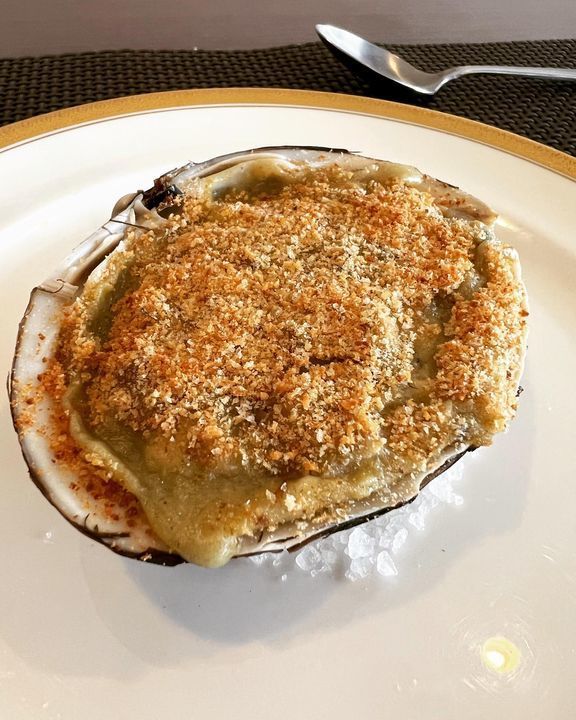 北寄貝と蛤を合わせてルーブランと野菜を合わせてこんがりと焼き上げます。