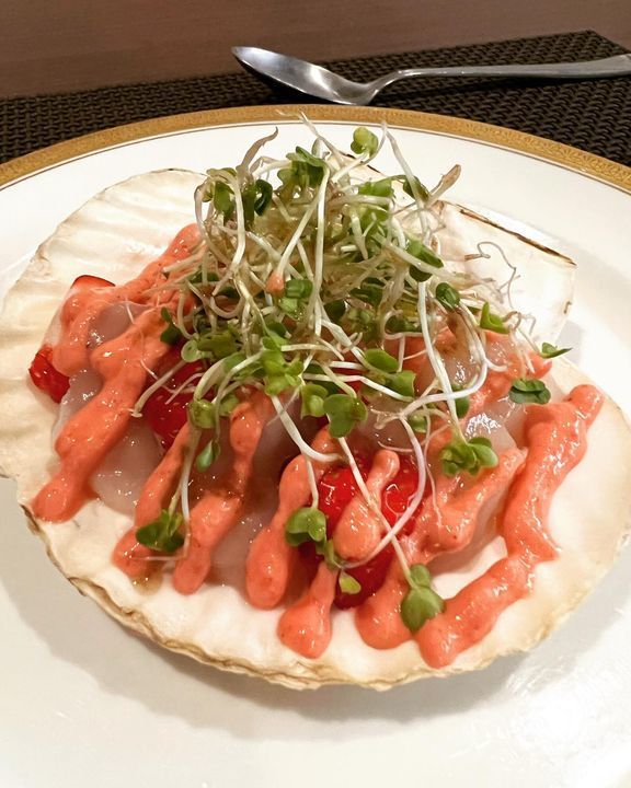 写真は春の定番 帆立といちごのサラダに春野菜のグレッグです。