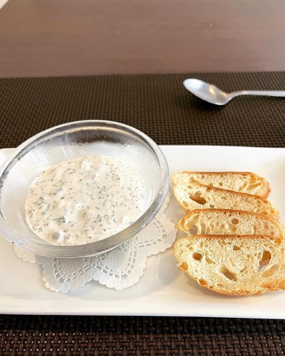 フロマージュブランに生クリームと白ワインとしろわいんビネガーニンニクをベースに、数種類の香草を合わせてあります。