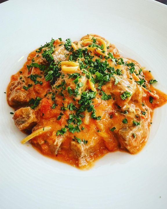 鹿 岡崎おうはん ベーコン フォアグラ 田舎風パテをザクザクにカットして特性トマトソースと絡めたフェットチーネです。