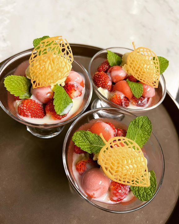いちご イチゴのスープ イチゴのソルベ バニラアイス アーモンドタルト シャンティ クレームパティシエールです。