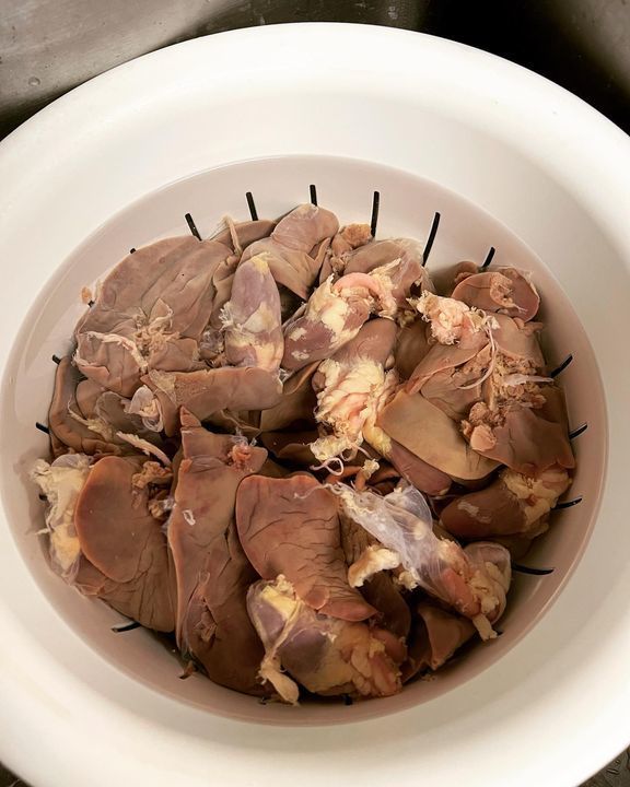 一晩水に浸けて血抜きをして卵 生クリーム ポルト酒 ブランデーと共にミキサーにかけて裏漉しして型に入れたら蒸し焼きします。