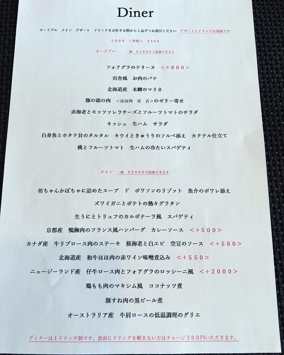 ディナーメニューは4000円のプリフィクスコースか 品数の多いシェフおまかせは8000円のコースの2種類です。