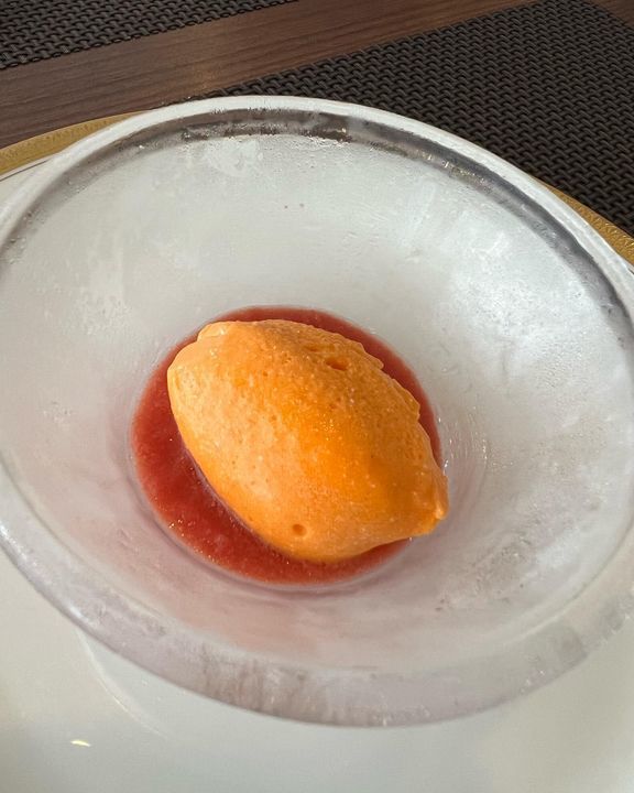 暑い中来店される方には今サービスでランチコースにこのムースかカボチャの冷たいスープをサービスしています。