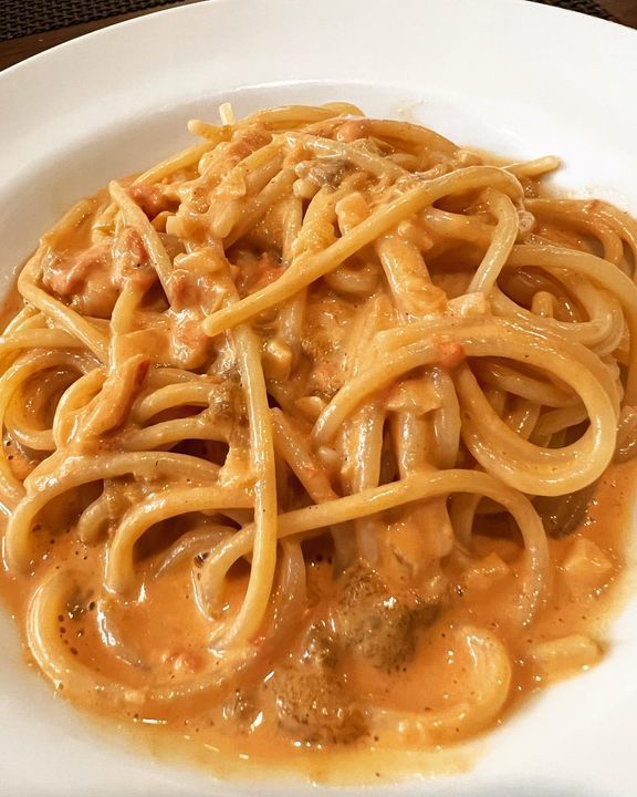 写真は試作した生ウニとトマトのクリームスパゲティです。