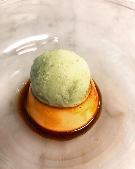 赤ピーマンのプリン バジルのシャーベット乗せ