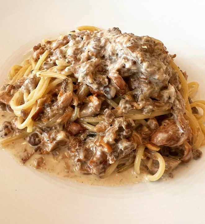 フランス産キノコ 玉ねぎ ベシャメルソース 生クリームでベースになるデュクセルを作り 数種類のフランス産キノコのバターソテーと追い生クリームと合わせスパゲティと絡めます。