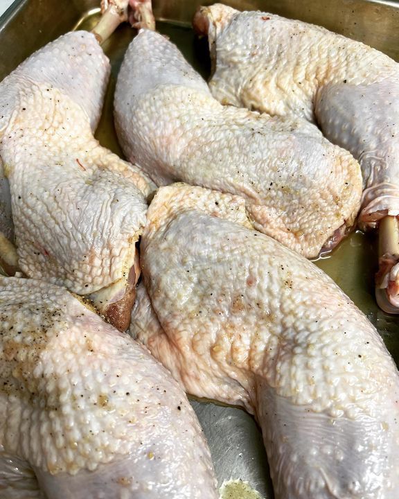 ディナーアラカルト用に骨付き岡崎おうはんのコンフィ仕込みました。