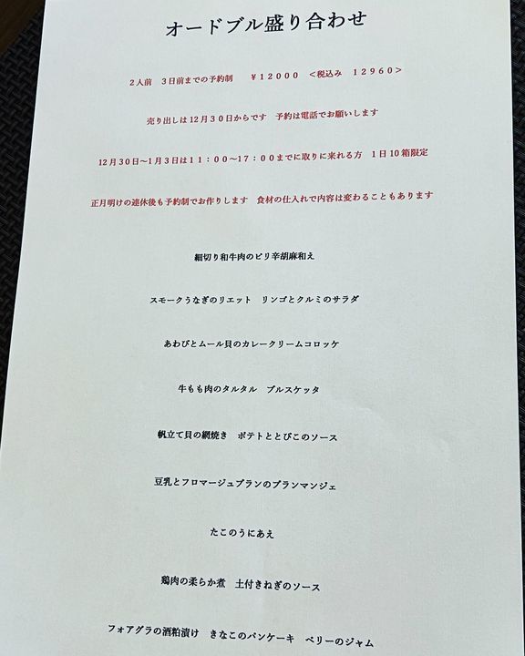内容は季節と仕入れで変わりますのでその度に変わる内容は電話でお応えします