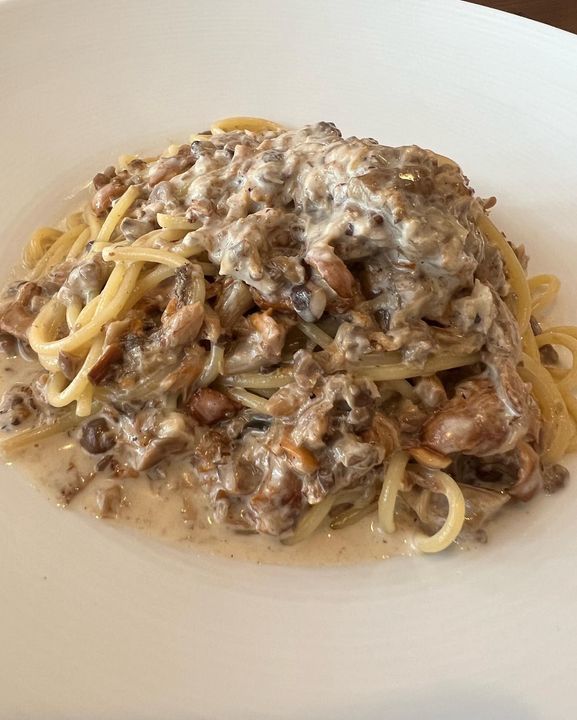 オーボリ茸 松茸 トランペット シャントレルなどのフランス産キノコをたくさん使ってバター 生クリーム パルミジャーノを合わせます