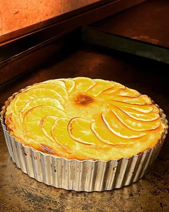 ハチミツマリネして厚切りにしたレモンをレモンのコンカッセを入れたアーモンドクリームに乗せて焼き上げました