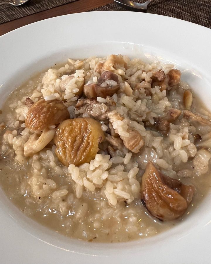 リゾット米を肉と魚介のブイヨンで軽く煮てフランス産の栗とヨーロッパ産のキノコを中心に色々数種類入れています