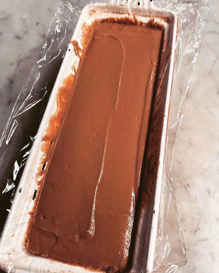 温めたブリオッシュの上に胡椒きかせたテリーヌを厚めにカットして乗せて、フルーツやポテトサラダを合わせました