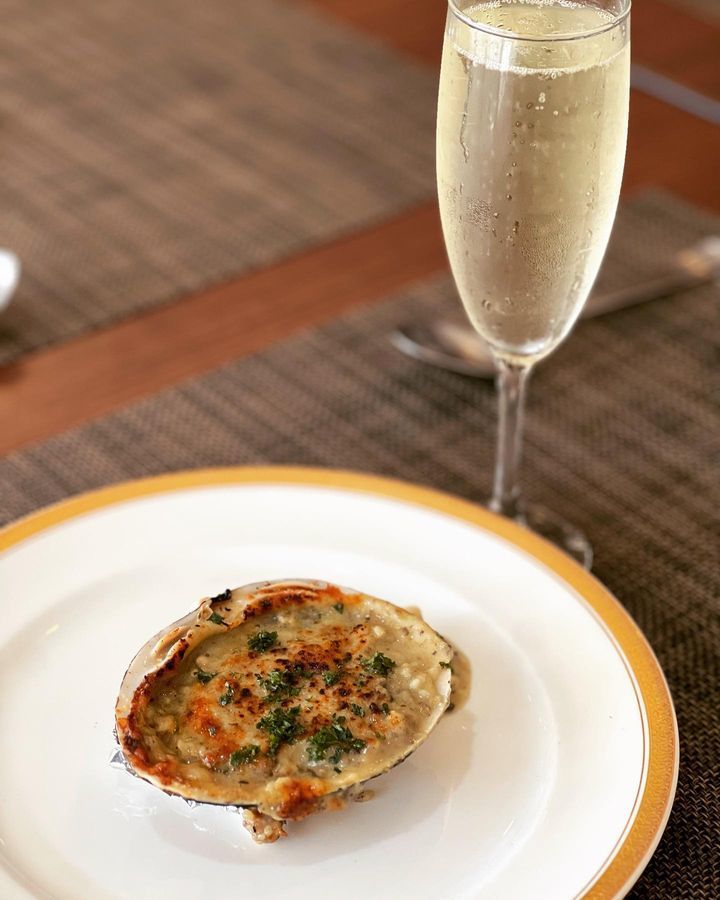 写真はオードブルの鮑 北寄貝 ムール貝のクリームグラタンです