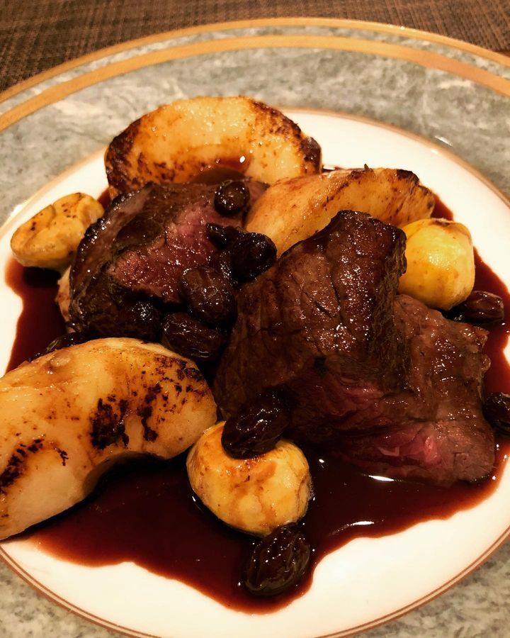 写真は牛肉とりんごのソテー 干し葡萄ソースです
