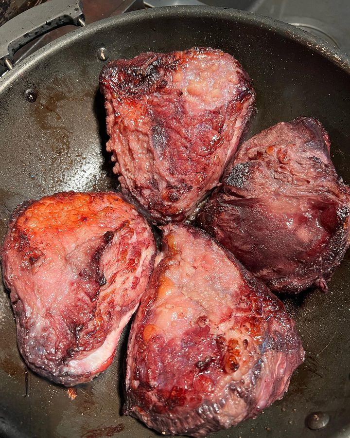 朝一で赤ワインに一晩漬け込んでいた和牛の頰肉で赤ワイン煮込み作ってます