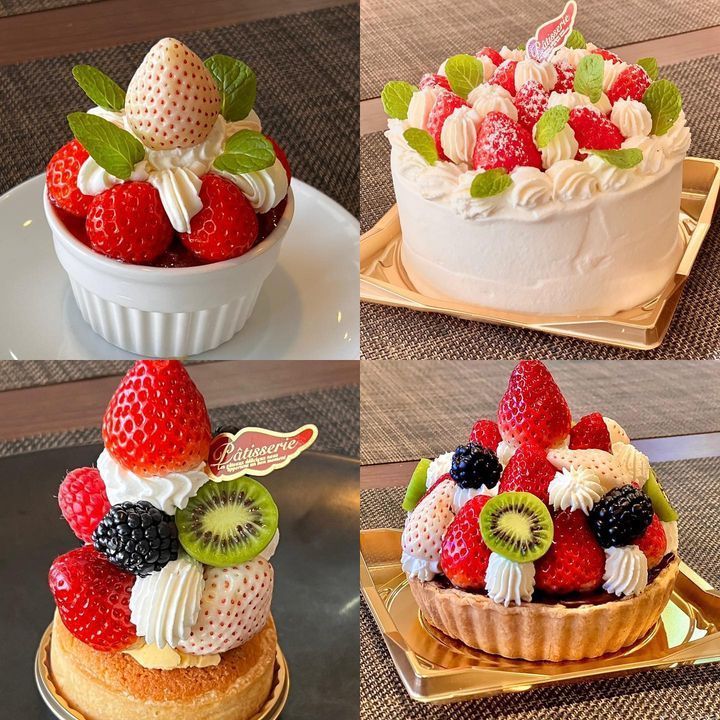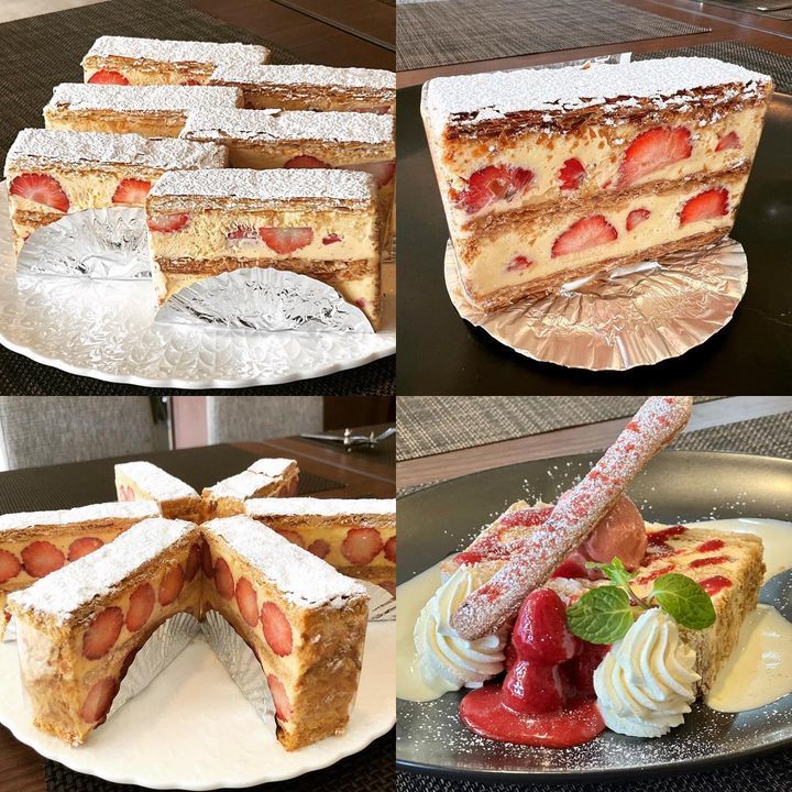 ケーキも春を感じるいちご色に変わりつついちごのナポレオンパイや赤いフルーツ使ったデザートや限定数の映えるいちごパフェなども用意しています