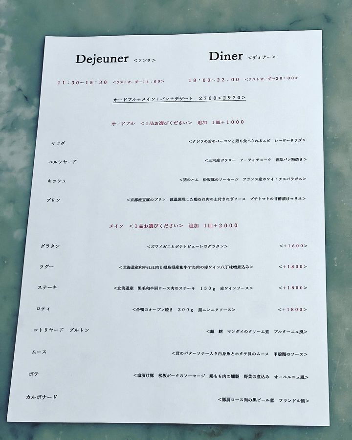 食事のメニューはランチもディナーも共通で2700円のプリフィクスコースか8000円の予約制のシェフおまかせコースの2種類を用意しています