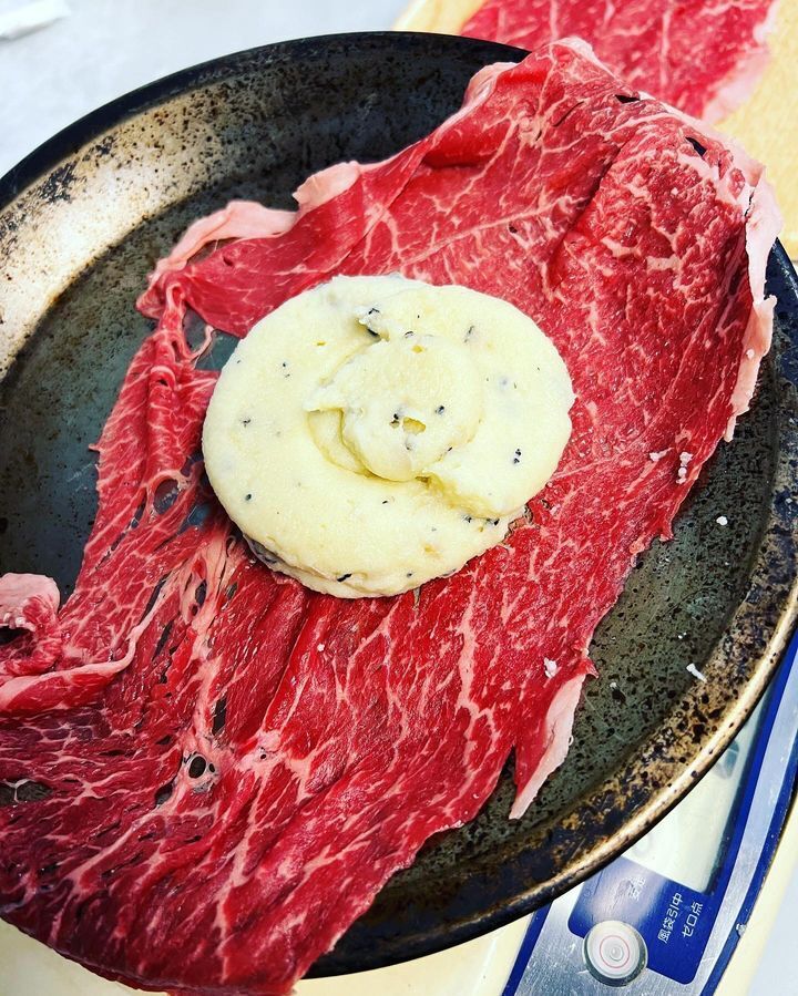 黒毛和牛の美味しいランプがが手に入っているのでトリュフ入りのジャガイモのピューレを包んだ“オモニエール”にしてみました
