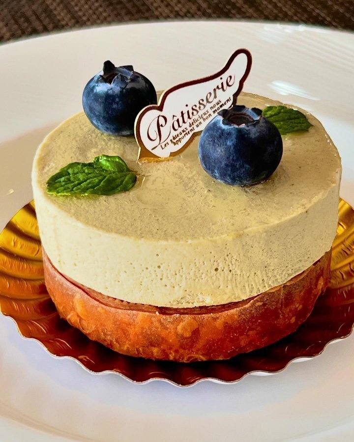 ミント入りのホワイトチョコレートのタルトパイにチョコレートとミントのババロアを重ねケーキ