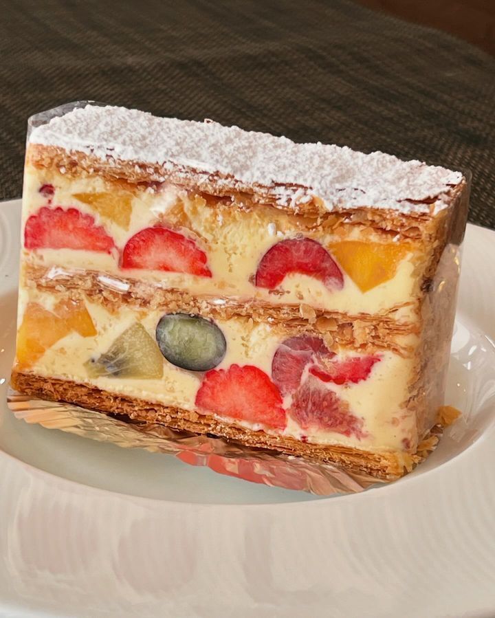 エリザベスパイは今まで出していたナポレオンパイの進化版で赤いフルーツを中心に数種類のフルーツを足したミルフィーユです